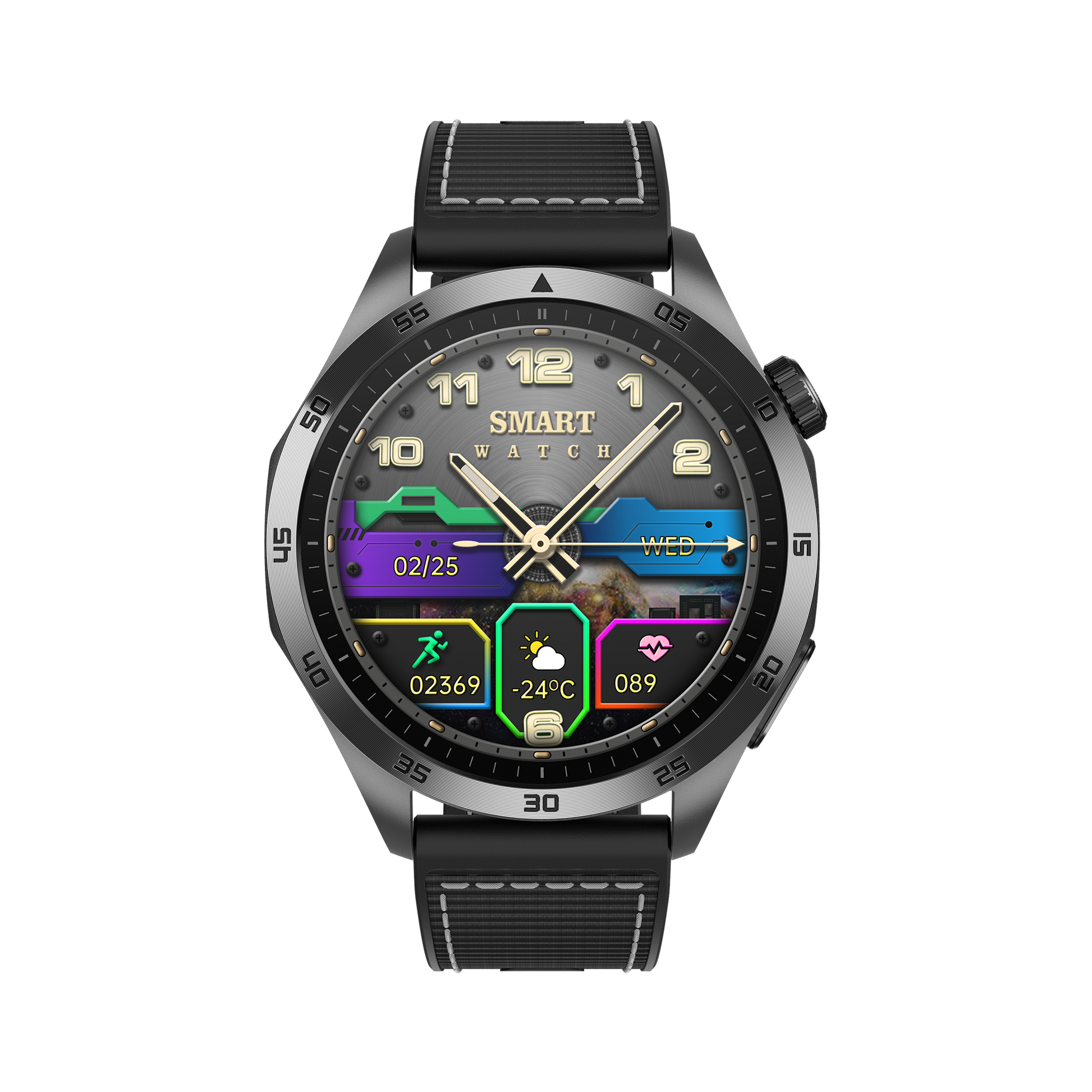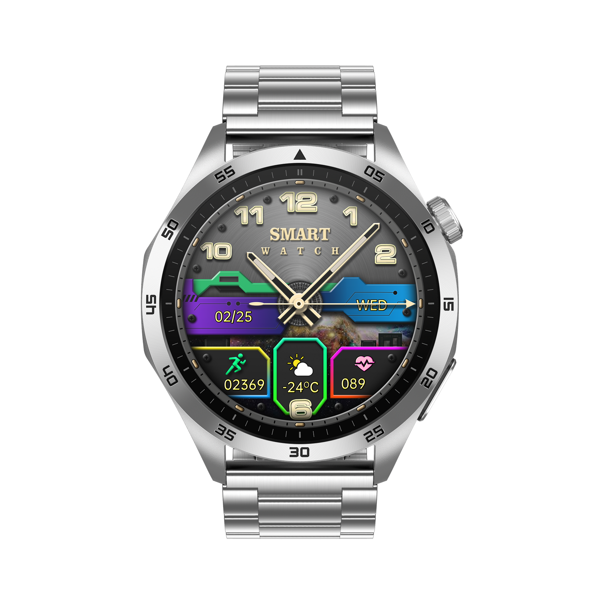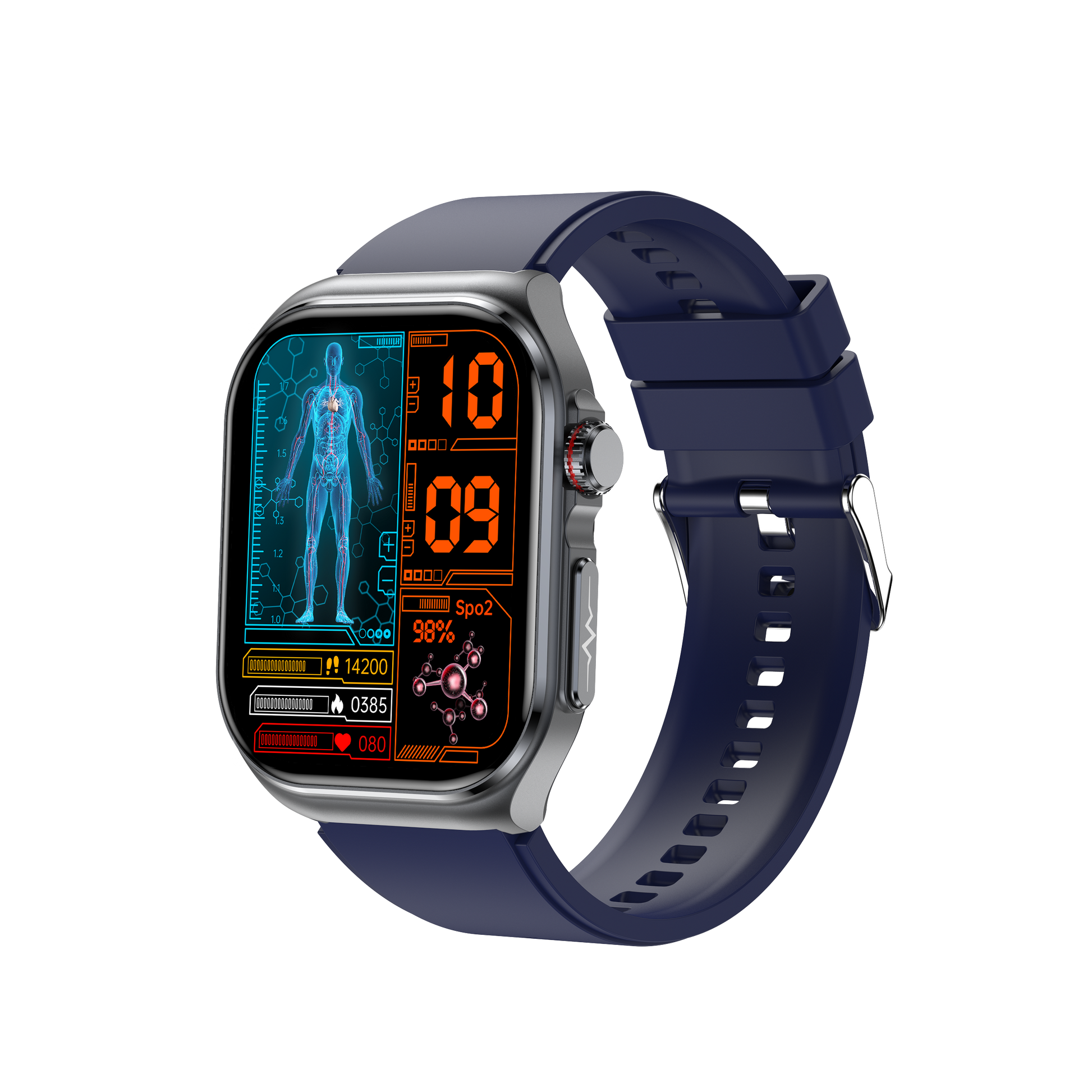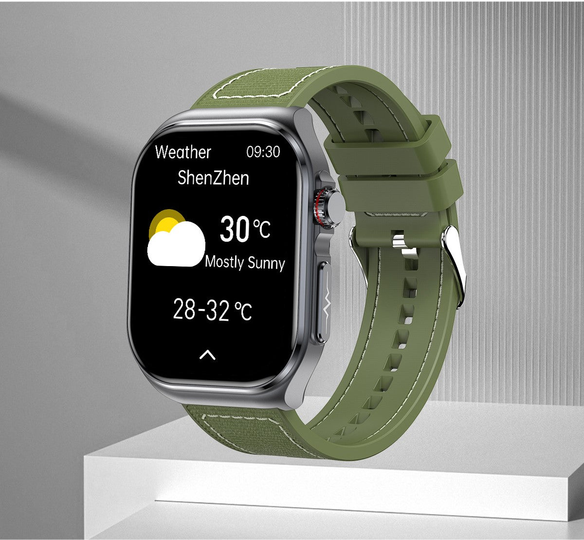 Modern: Modernes, eckiges Design mit erweiterten, benutzerfreundlichen Features, wie der neuen drehbaren Krone, die eine intuitive Navigation ermöglicht.
