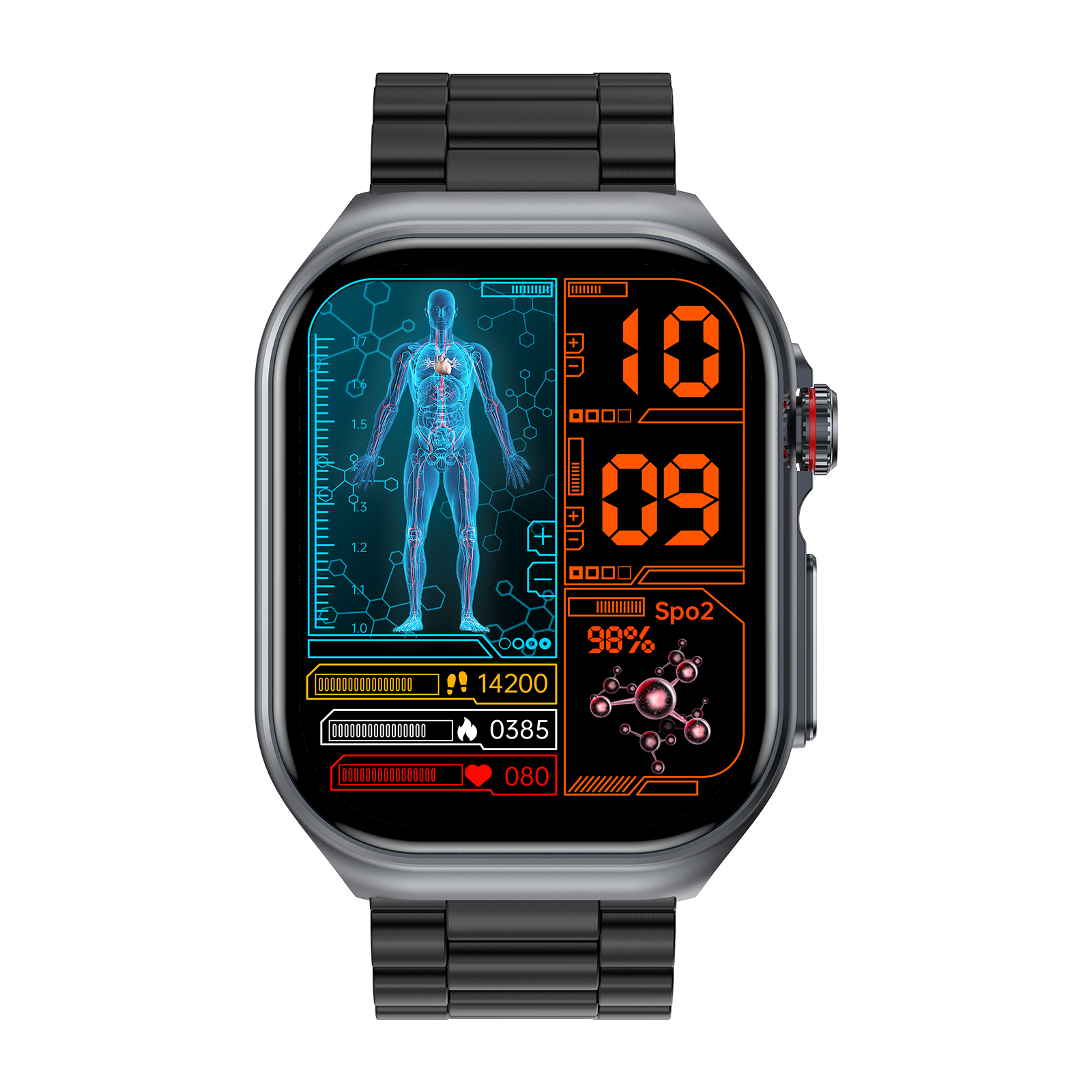 Brillantes Display für bessere Sichtbarkeit: Mit einem neuen 2.04 Zoll grossen AMOLED Touchscreen bietet die CARE Pro 4 Plus eine gestochen scharfe Darstellung Ihrer Gesundheitsdaten.