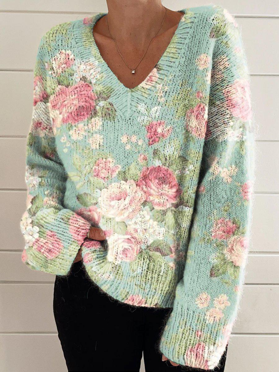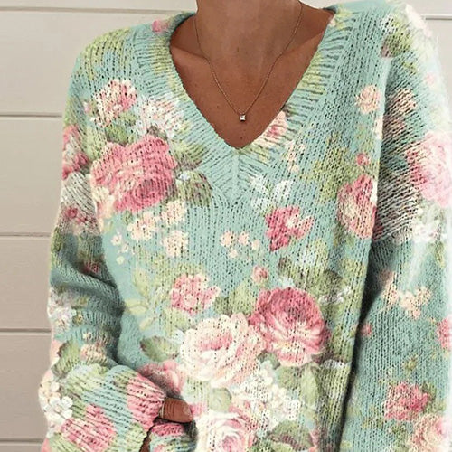 Erleben Sie mühelosen Stil und Komfort mit unserem frischen Langarmpullover mit V-Ausschnitt und Blumendruck. Dieser aus hochwertigen Materialien gefertigte Pullover verfügt über einen schmeichelhaften V-Ausschnitt und ein wunderschönes Blumenprint-Design, was ihn perfekt für jeden Anlass macht. Bleiben Sie gemütlich und modisch mit diesem vielseitigen und trendigen Pullover.