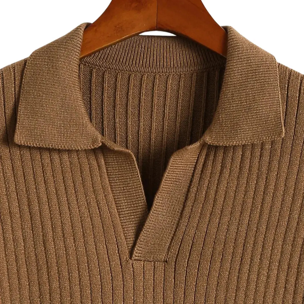 Bleiben Sie die ganze Saison über gemütlich und stilvoll mit dem V-Neck Polo Sweater Ribbed - eine unverzichtbare Ergänzung zu Ihrer Kollektion.